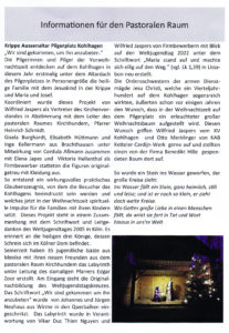 Erstmals gab es auf dem Kohlhagen unter dem Altardach des Pilgerplatzes in Personengröße die heilige Familie mit dem Jesuskind in der Krippe und Maria und Josef. Koordiniert wurde dieses Projekt von Wilfried Jaspers als Vertreter des Kirchenvorstandes in Abstimmung mit dem Leiter des pastoralen Raumes Kirchhundem, Pfarrer Heinrich Schmidt. Gisela Burghard, Elisabeth Hüttmann und Inge Kellermann aus Brachthausen unter Mitwirkung von Cordula Aßmann zusammen mit Elena Japes und Viktoria Hellenthal als Firmbewerberinnen statteten die Figuren originalgetreu mit Kleidung aus. Eingeflossen in die Finanzierung sind unter anderem auch Kirchensteuermittel.